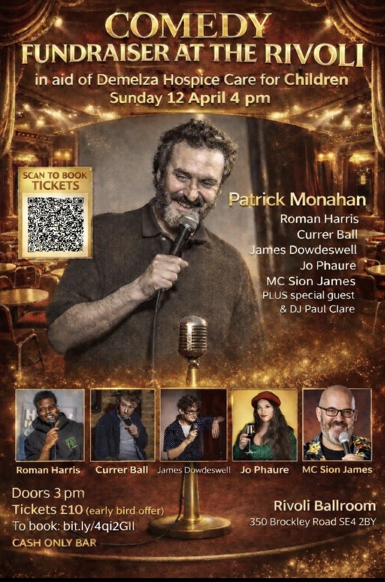 TweetSunday 12th April 2026 4-7pm: Comedy Charity Fundraiser for Demelza Hospice for children at The Rivoli Ballroom Brockley SE4 : Patrick Monahan, Roman Harris, James Dowdeswell, Currer Ball, Jo Phaure & Host Siôn James ***special guest tbc***