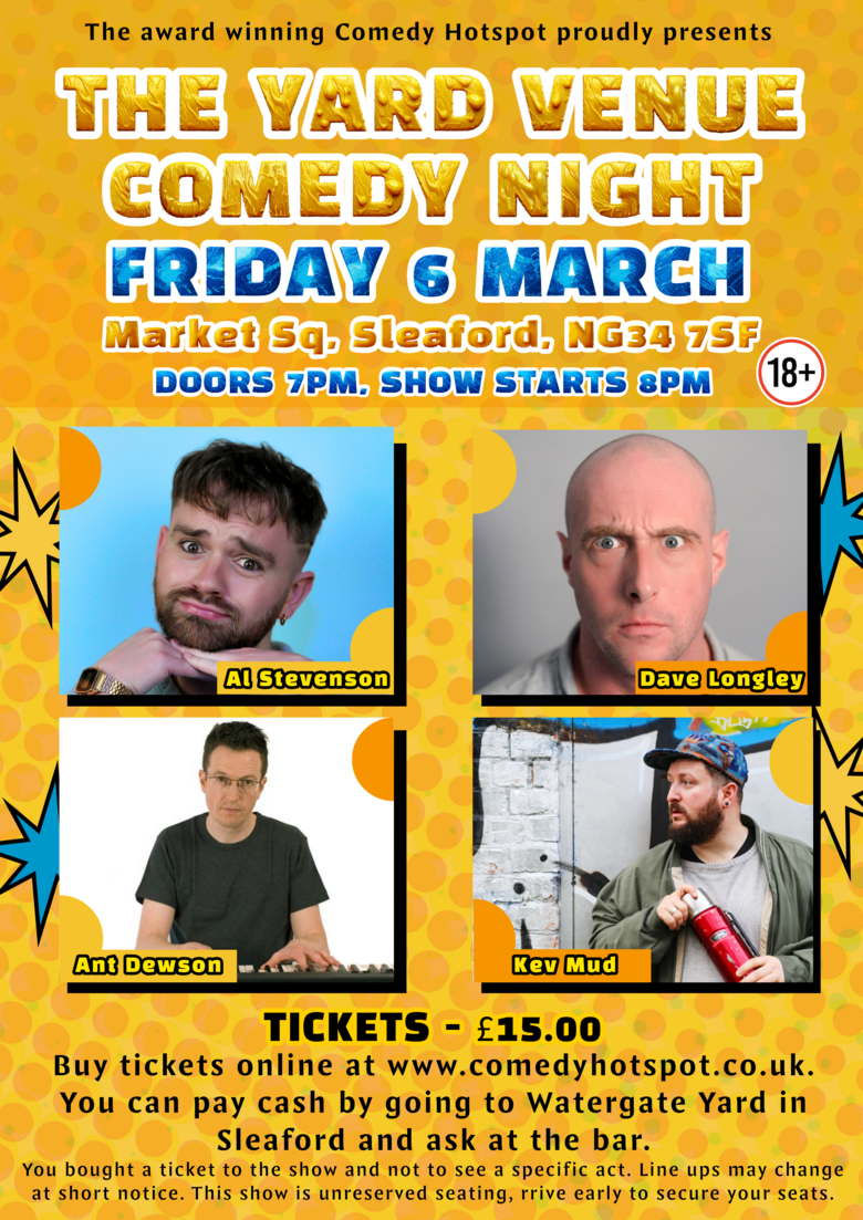 TweetSleaford's longest running comedy club is back at The Yard Venue. You get an award winning Comedy Promoter who excels at putting on live shows, in a great space for live comedy. Nothing is left to chance in the pursuit of the perfect night and it's that dedication which delivers top class shows every single time.