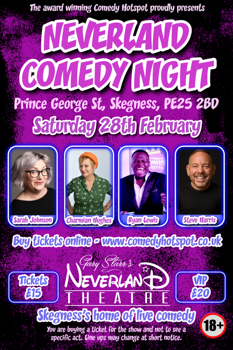 Comedy Hotspot are synonymous with top class comedy shows and I am excited to be bringing more shows to Neverland Theatre in Skegness. We have established the only professionally run Stand Up Comedy Club in Skegness and you can expect very high quality comics, a show run as a professional club, in a wonderful purpose built space. This event is unreserved seating so arrive early to get the seats you want.